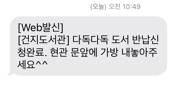 이렇게 문자를 받고나면, 잘 읽었던 책을 반납가방에 넣어 문밖에 내놓으시기만 하면 찾아갑니다.^^