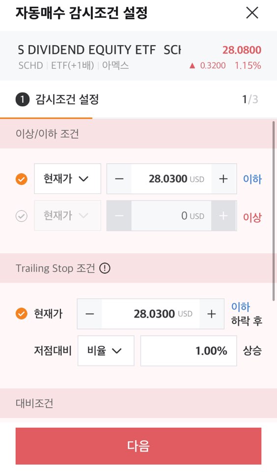 3. '감시조건 설정'에서 본인의 종목(저는 SCHD) '현재가' '28.0300USD' 이하> Trailing stop 조건으로는 '현재가''28.0300USD'이하,비율 '1.00%' 상승을 클릭합니다.