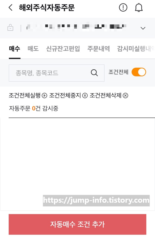 2. '해외주식 자동주문' 검색> '매수' > '자동매수 조건 추가' 클릭